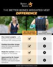 It is critical for women with osteoporosis to use the flex metal weights like the ones in our weighted products. They are soft so if you should trip or fall they will not apply pressure on the bone like a traditional hard metal bar weight found in other vests and belts. This is one of the reasons Dr. Brown strongly feels that these are the best weighted exercise products for women with osteoporosis and we have successfully been selling them for more than 10 years!